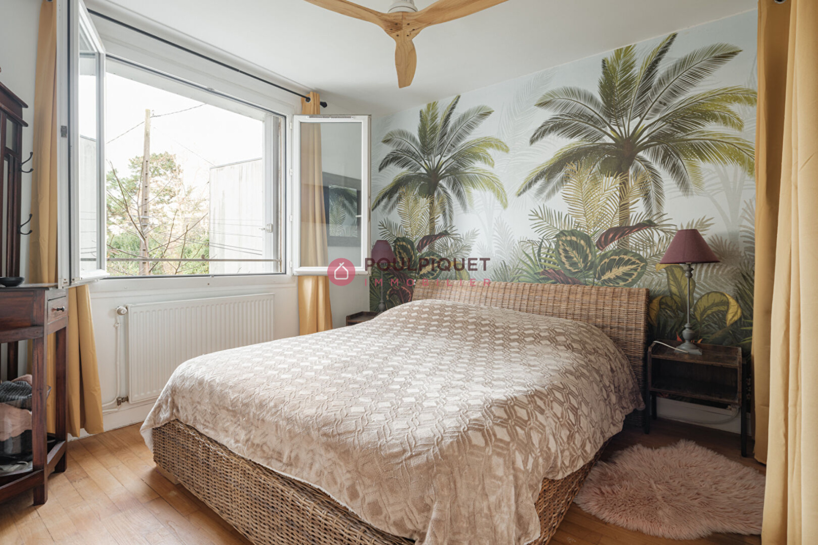 La chambre, également sur parquet, donne sur le jardin de la copropriété, ce qui la rend particulièrement calme. Elle dispose d'un grand dressing attenant.