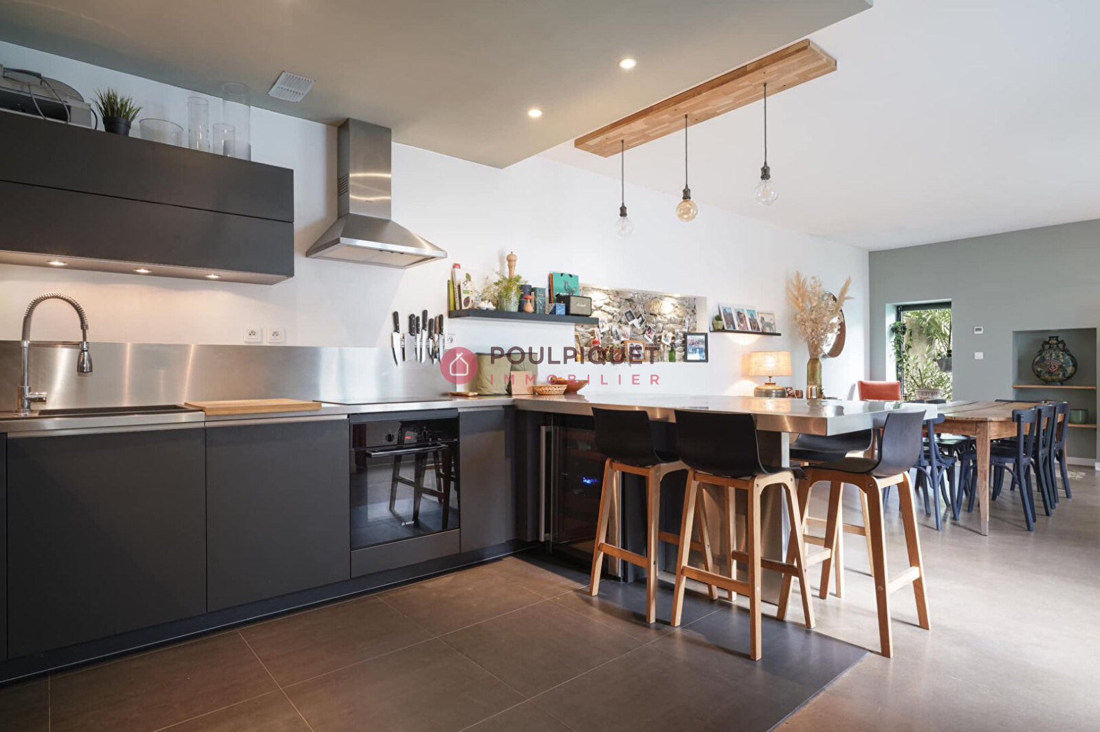 Toiture en ardoise naturelle refaite intégralement fin 2022, extension très lumineuse en 2020 avec un bardage en zinc, une grande place de stationnement en sous-sol et une cave viennent en annexes de cette belle maison joliment décorée.
